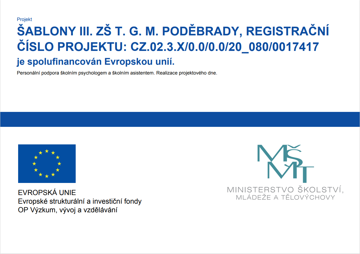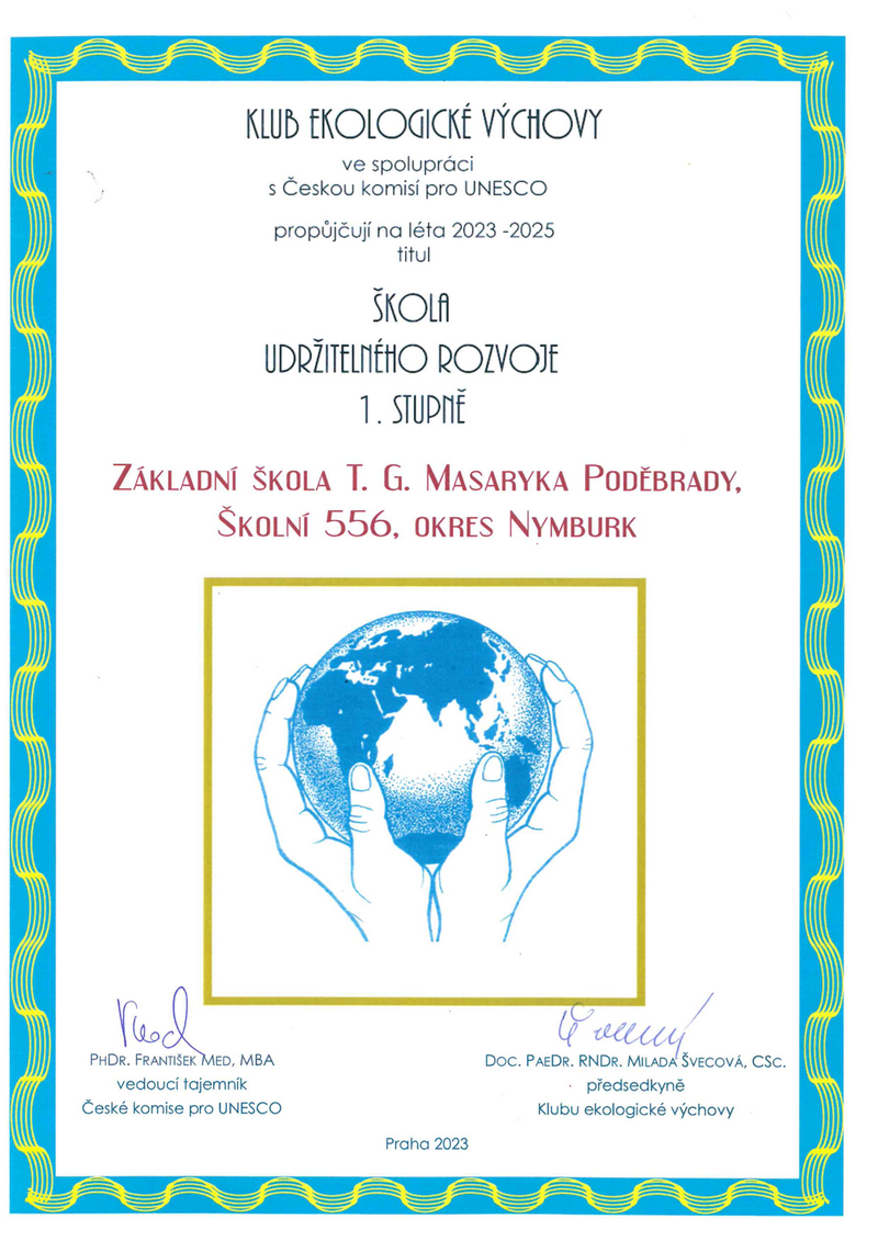 Základní škola T. G. Masaryka v Poděbradech je městskou plně organizovanou školou založenou v roce 1937. Sídlí ve dvou budovách: ve Školní ulici, kde je ředitelství školy, učebny 2. stupně a část učeben 1. stupně, a v Žižkově ulici, kde je druhá část učeben 1. stupně. Žáci se vzdělávají ve kvalitním zázemí, které tvoří školní hřiště, počítačové pracovny, odborné pracovny i s digitálním mikroskopem, vizualizérem nebo chemická laboratoř. Výuka pracovních činností probíhá ve školní dílně, cvičné kuchyni a také na školním pozemku, jehož součástí je také skleník. V hodinách pracovního vyučování 1. stupně žáci využívají pracovnu s keramickou pecí. Pravidelně je vybavováno i materiální zázemí učeben.