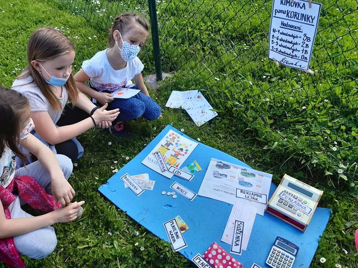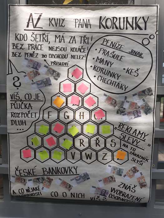 Jedno odpoledne nás čekala velká společná venkovní akce. Děti na stanovištích plnily úkoly. Někde odhadovaly ceny, jinde vysvětlovaly finanční pojmy, počítaly, v Kimově hře procvičily paměť. Celé odpoledne jsme si všichni náramně užili a děti si opět vydělaly nějaký ten družinový peníz. V dalším týdnu si Předňáci porovnali své finanční znalosti se Zadňáky v AZ kvízu. I tato společná hra se moc povedla. Soutěžící až překvapili svými nově nabitými znalostmi. Projekt jsme zakončili nákupem v družinových krámcích za vydělané peníze. Finanční gramotnost pro děti má smysl!