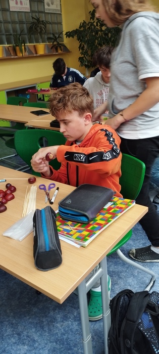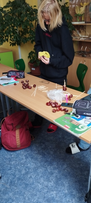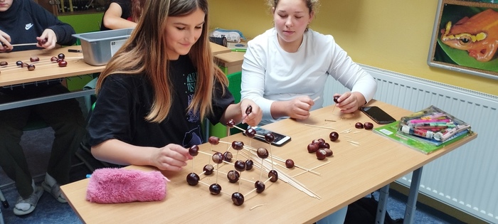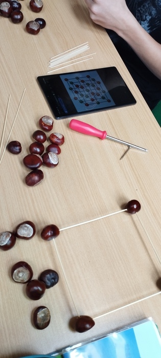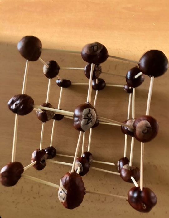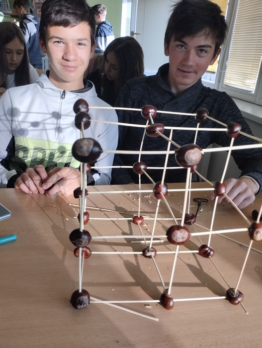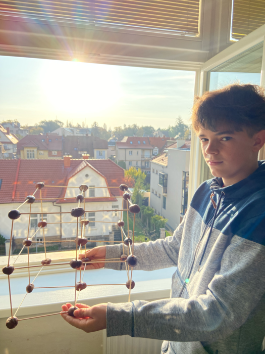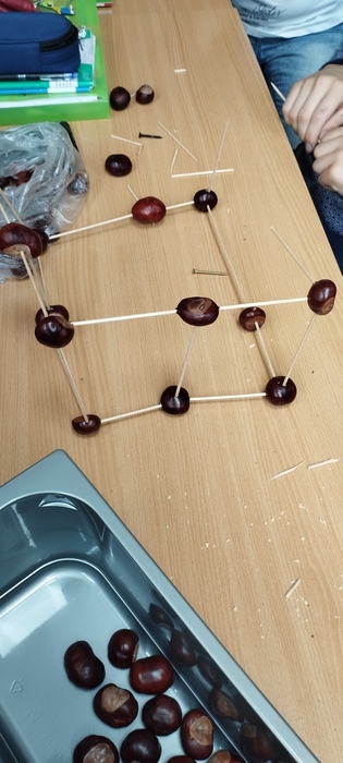 „Přineste si na následující hodinu 10 kaštanů a 5 špejlí.“ Takto znělo zadání pro jednu z hodin přírodopisu v 9. D, kde se zaobíráme tématy mineralogie. Ačkoli očekávání o tvorbě zvířátek nebylo naplněno, přesto se v jednom bodě žáci nespletli – tvoření ze semen jírovce maďalu a špejlí bylo skutečně v plánu hodiny. Žáci tvořili model krystalové mřížky, která popisuje polohu částic v krystalu. Vybrán pro tento účel byl model kuchyňské soli NaCl. Matku přírodu se nám povedlo napodobit v sestavování 3D modelů na výbornou, protože ani ta nevytváří dokonalé a ideální krystalické mřížky.
