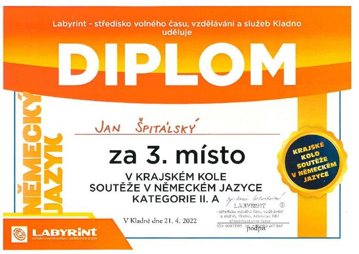 Žák naší školy, Jan Špitálský, vítěz okresníko kola Olympiády v německém jazyce v kategorii II. A, se zúčastnil dne 21. 4. 2022 krajského kola, které se konalo v Kladně, a vybojoval krásné 3. místo.