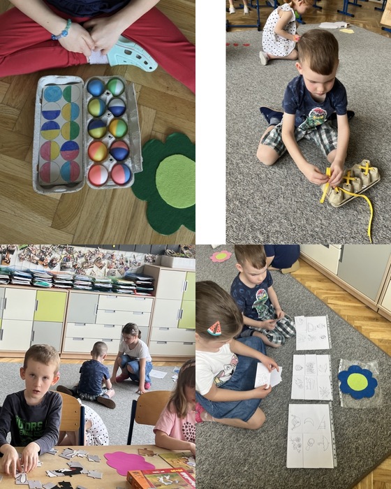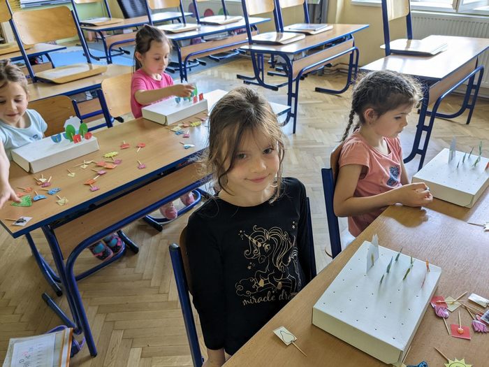 Práce na stanovištích učí naše budoucí prvňáky soustředění, trénuje paměť, zapojení logického myšlení, matematické a prostorové pojmy. Úchop malých předmětů do špetky je dobrý pro nácvik správného držení tužky. Důležité je umět práci dokončit, být trpělivý a případnou chybu opravit. A protože je duben - měsíc bezpečnosti, na setkání jsme si připomněli pravidla chodců.