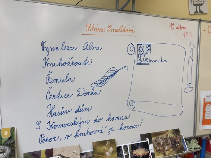 To je název knihy Kláry Smolíkové, která provázela žáky naší školy putovní výstavou. Umístěné panely lákaly k nahlédnutí a přečtení. Byly také nápovědou k pracovním listům, na kterých jsme pracovali. Učitelům a žákům byl připraven padlet plný informací nejen ke knize, ale také k autorce a ilustrátorovi Janu Šedovi. Čtenáři si mohli vyzkoušet kvíz, který odhaloval práci spisovatelky.