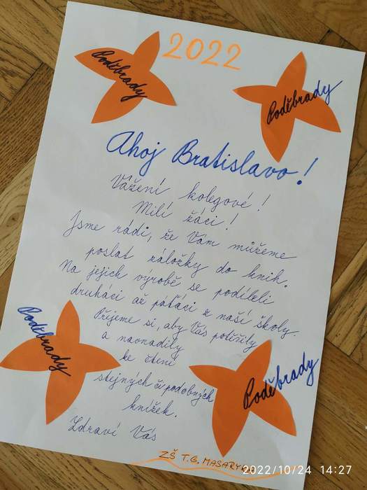 Podporujeme čtenářství, proto jsme se do projektu rádi zapojili. Vyrobili jsme 400 záložek, které jsme poslali naší partnerské škole. Věříme, že naše záložky slovenské žáky potěší a třeba je inspirujeme ke čtení nové knihy.