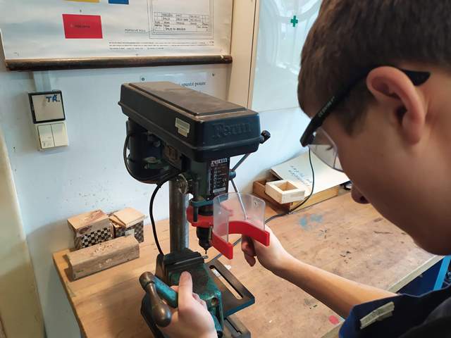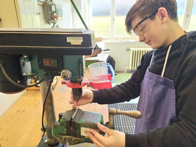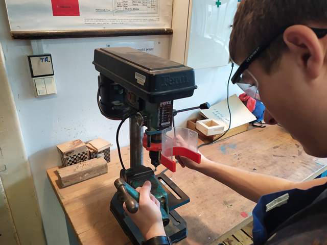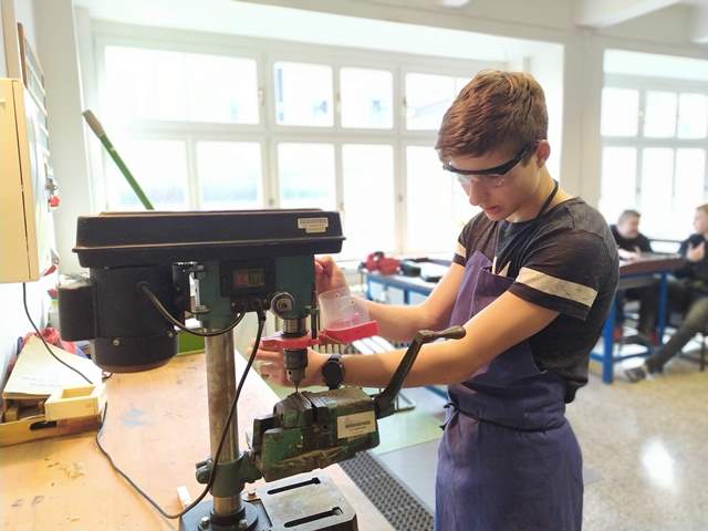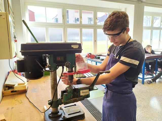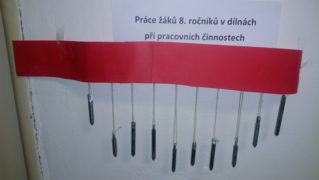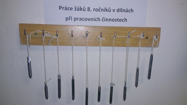 Chlapci z 8. ročníků vyráběli při pracovních činnostech zajímavý výrobek z kovu, olovnici. Tu následně využijí při výuce v hodinách fyziky. Olovnice se jim moc povedla a jsou rádi, že mohou svým výrobkem pomoci i k výuce jiných předmětů.