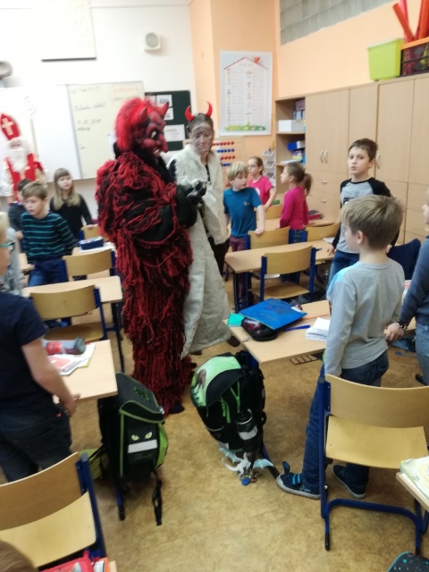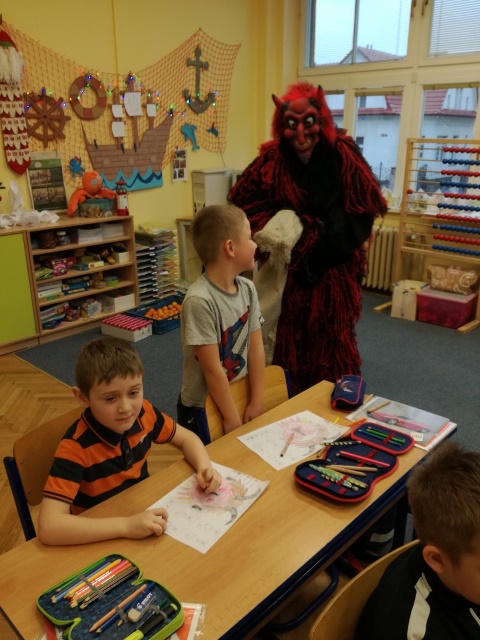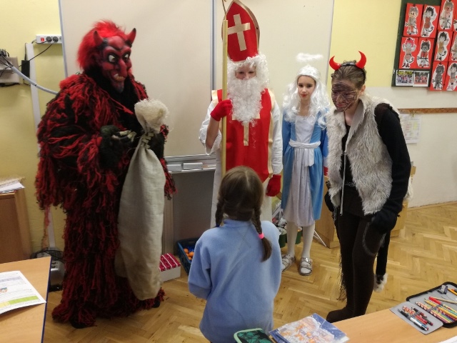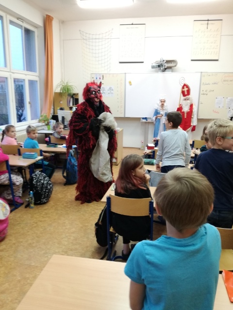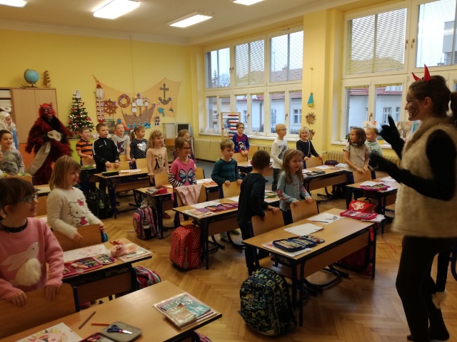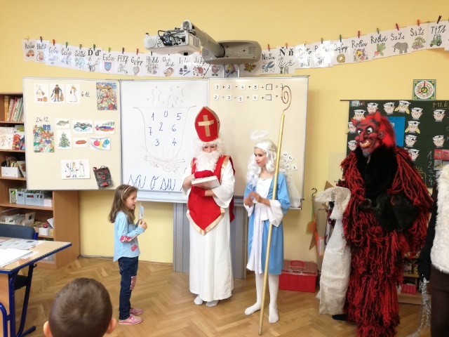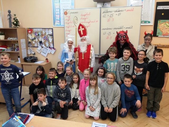 Jako každý rok se k nám dne 5. 12. přišel podívat Mikuláš i s celým svým doprovodem, andělem, čertem a čerticí. Zavítali do všech prvních a druhých tříd, kde jim děti zazpívaly písničky a zarecitovaly básničky. Nakonec si čerti neodnesli ani ty největší rošťáky, ale slíbili, že si je příští rok přijdou zkontrolovat. Mikuláš s andělem rozdali dětem bohatou nadílku a všichni byli spokojení. Nashledanou za rok!
