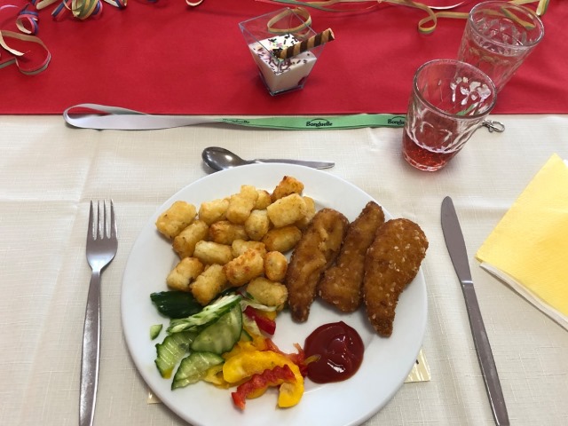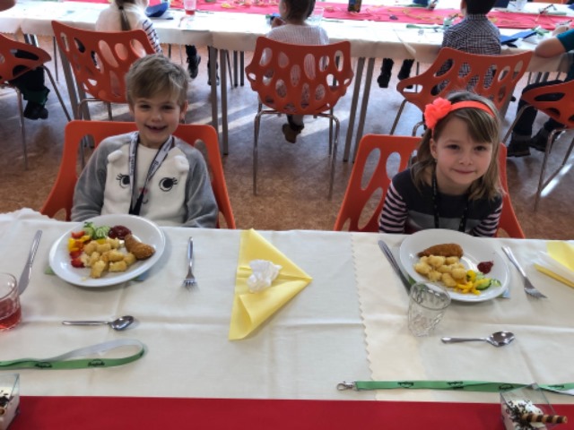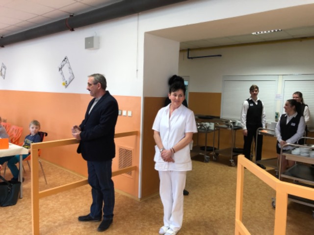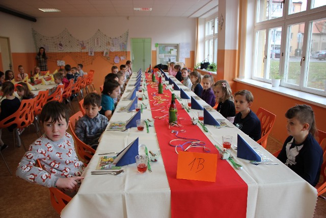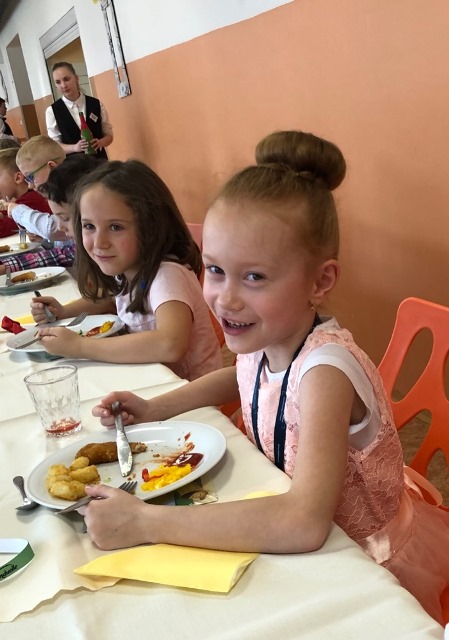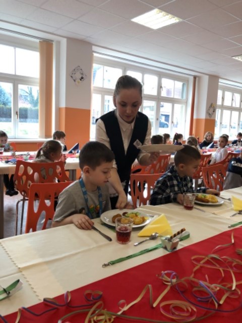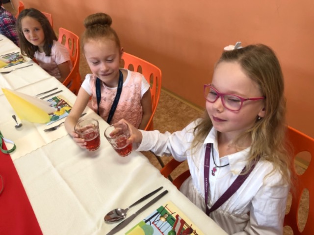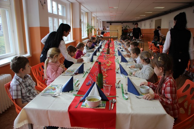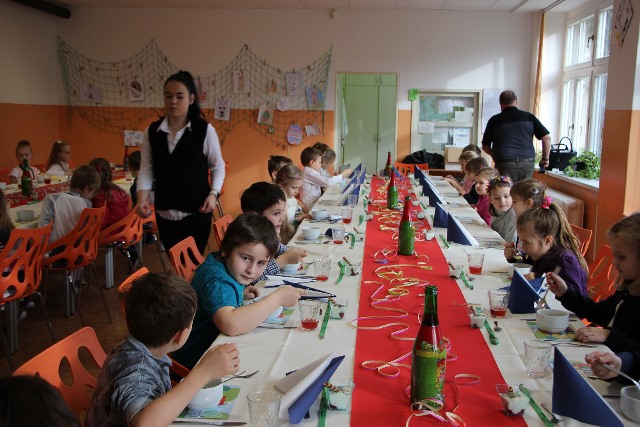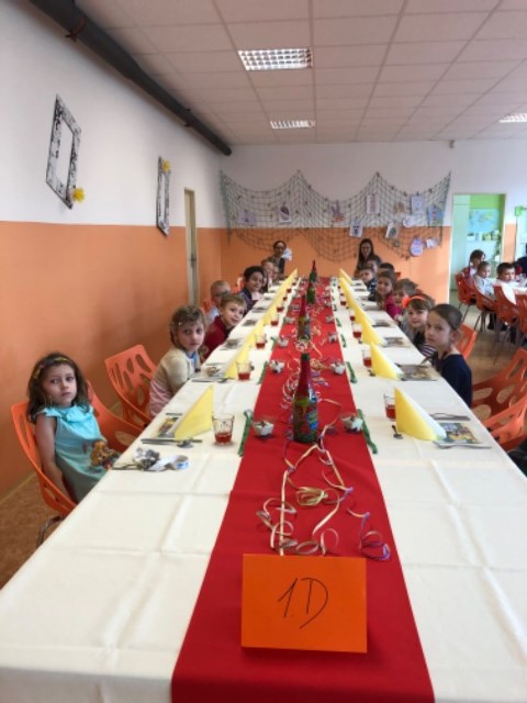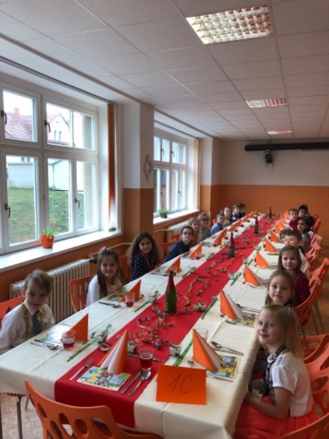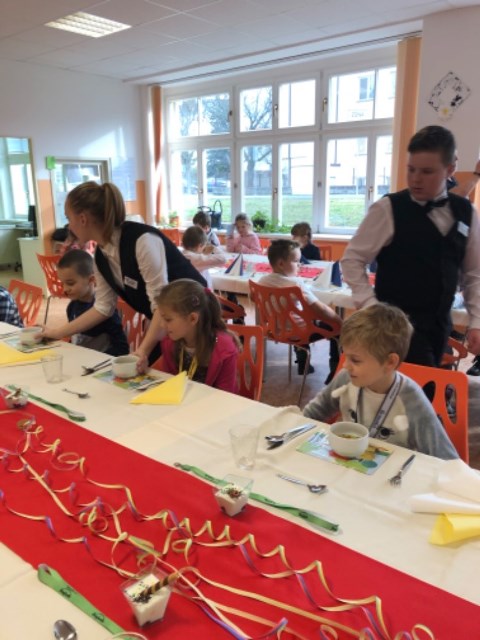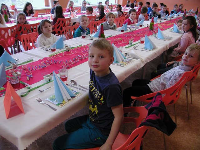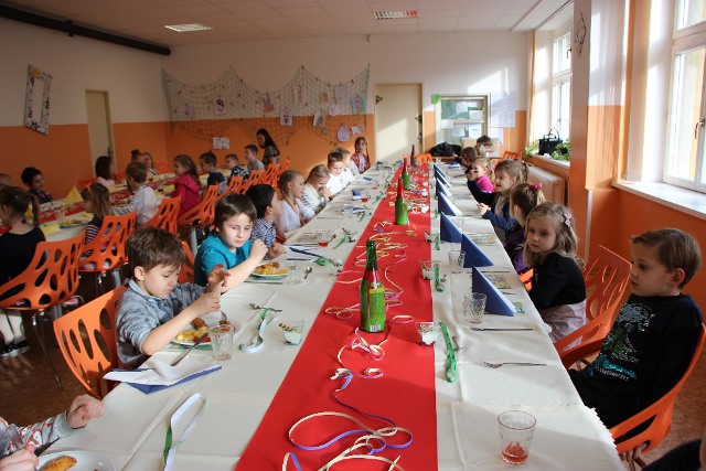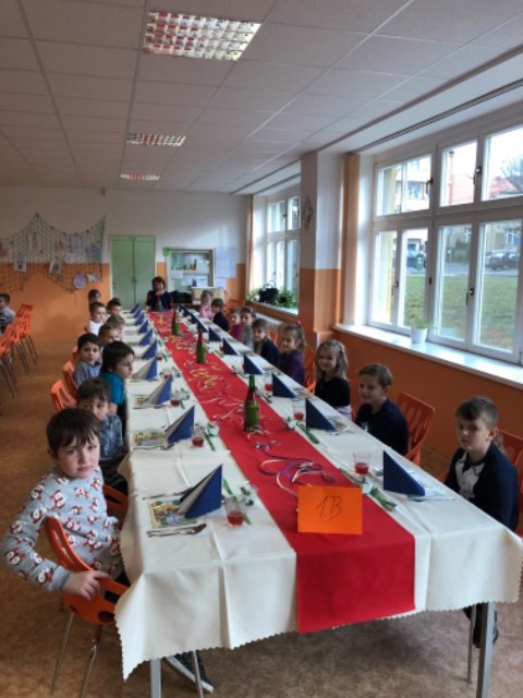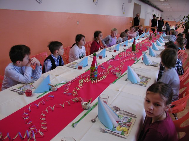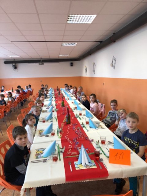 Než si ti nejmladší odnesli domů svá krásná vysvědčení, měli možnost prožít příjemné chvíle se svou paní učitelkou a spolužáky ve školní jídelně, která se proměnila k nepoznání. Slavnostní oběd pro nás připravily naše paní kuchařky spolu s učni a paní mistrovou ze Středního odborného učiliště společného stravování v Poděbradech. Ti naše prvňáčky obsluhovali jako v restauraci. Nenásilnou formou jsme tak naše prvňáky učili společenskému stolování a základům etikety. Nechyběl slavnostní přípitek, kterého se zhostil pan ředitel. Ocenil jejich práci za 1. pololetí. Všichni, bez rozdílu, zvládli první školní úskalí a udělali na sobě velké pokroky.